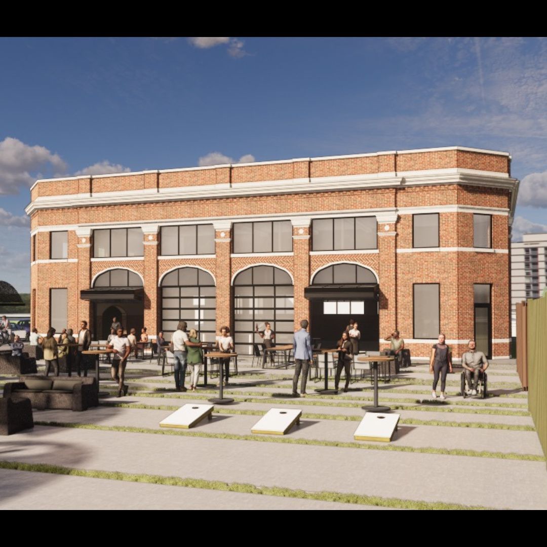 The exterior rendering illustrates the property’s transformation potential, reimagining the building with a modern façade, expansive glass, and clean architectural lines while still respecting the scale and presence of the original structure. This concept demonstrates how the site can evolve into a contemporary commercial destination that complements surrounding development while standing out as a focal point.
